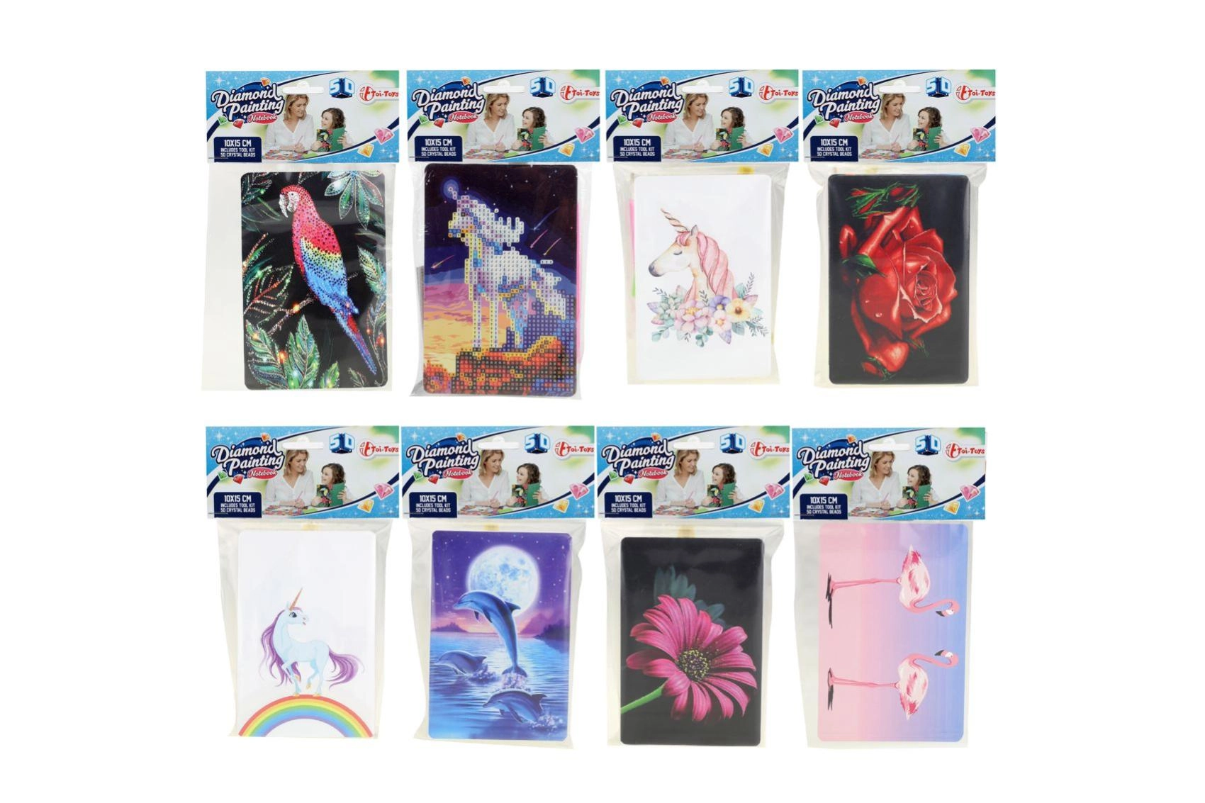 Katrā dimanta gleznošanas komplektā ir iepriekš apdrukāts audekls ar līmējošu kārtu un DMC leģendu, akrila kristāliņi (apaļi/kvadrātveida), aplikators/pildspalva ar vasku, paplāte un maisiņi šķirošanai; bieži arī pincete. Pateicoties kvalitatīvai apdrukai, spēcīgai saķerei un precīzam marķējumam, kristāliņus ir viegli izvietot, un gatavā dimanta mozaīka mirdz kā 5D kristāls. Radošais process ir vienkāršs iesācējiem, taču ved pie detalizēta attēla un attīsta koncentrēšanos un sīko motoriku.