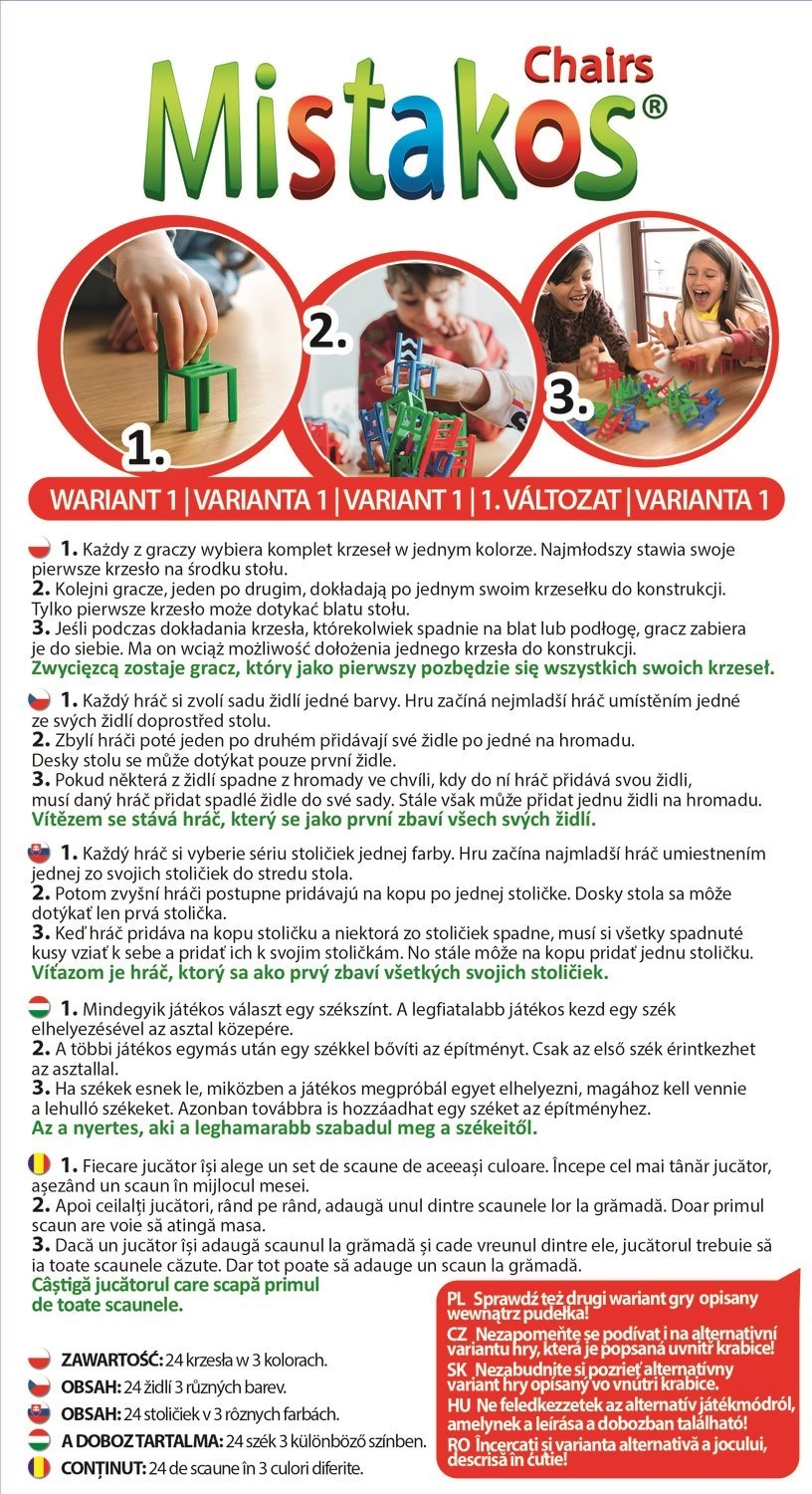 Mistakos ir lieliska izvēle gan bērniem, gan pieaugušajiem. Krāsainie krēsliņi tiek kārtoti arvien augstākā un jautrākā konstrukcijā, kas pārbaudīs jūsu pacietību un precīzu roku. Vai pārbaudīsiet, cik daudz krēslu spēsit salikt, pirms viss kāju un atzveltņu mudžeklis sabrūk?