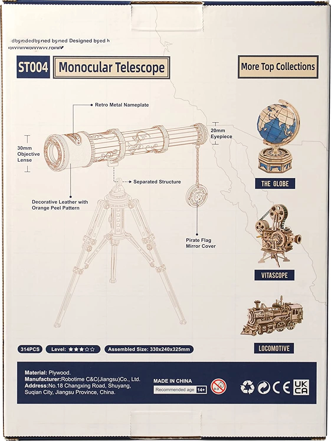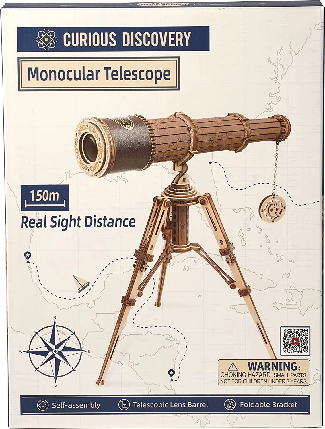 Atklājiet būvēšanas burvību ar 3D koka modeli monokulārā teleskopa ROBOTIME Rokr. Šis skaisti dekorētais teleskops piedāvā trīskāršu palielinājumu un reālu novērošanas attālumu līdz pat 150 metriem, padarot to par ideālu dekoratīvu un funkcionālu elementu.