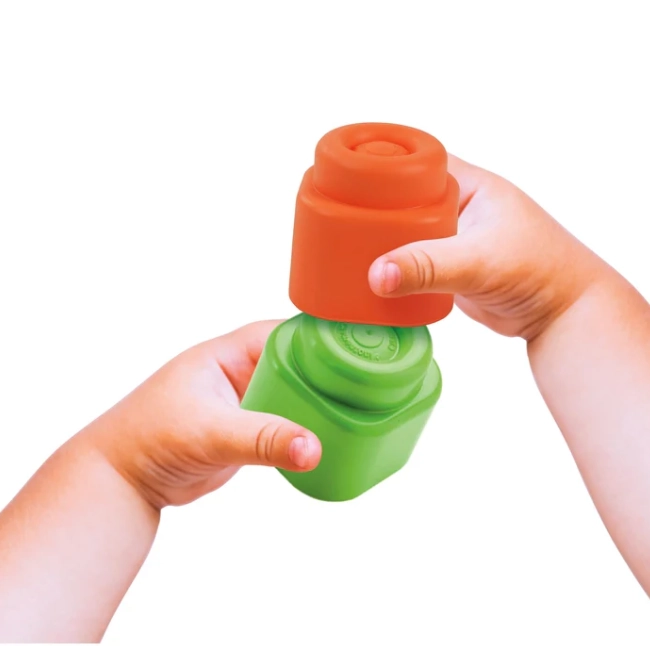 Astoņi mīkstie kluči ir viegli satverami un ievietojami paklājiņu iedobēs – lieliski piemēroti sīkās motorikas un roku–acu koordinācijas treniņam.