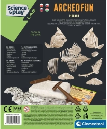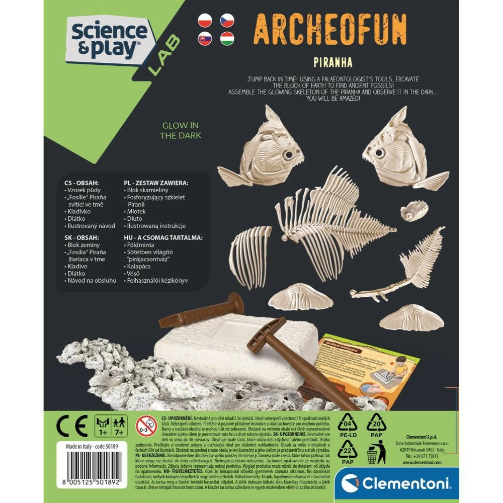 Kļūsti par mazu paleontologu un atklāj plēsīgās zivis – piraņas – skeletu! Šis izklaidējošais arheoloģijas komplekts no zīmola Clementoni ļauj bērniem ar pievienotajiem instrumentiem uzmanīgi “izrakt” fosiliju un salikt spīdošu piraņas skeletu. Pēc ilustrētās instrukcijas uzzināsiet vairāk par fosilijām, to veidošanos un par to, kur mūsdienās dzīvo piraņas. Lieliska izvēle prasmu, radošuma un intereses par zinātni attīstīšanai.