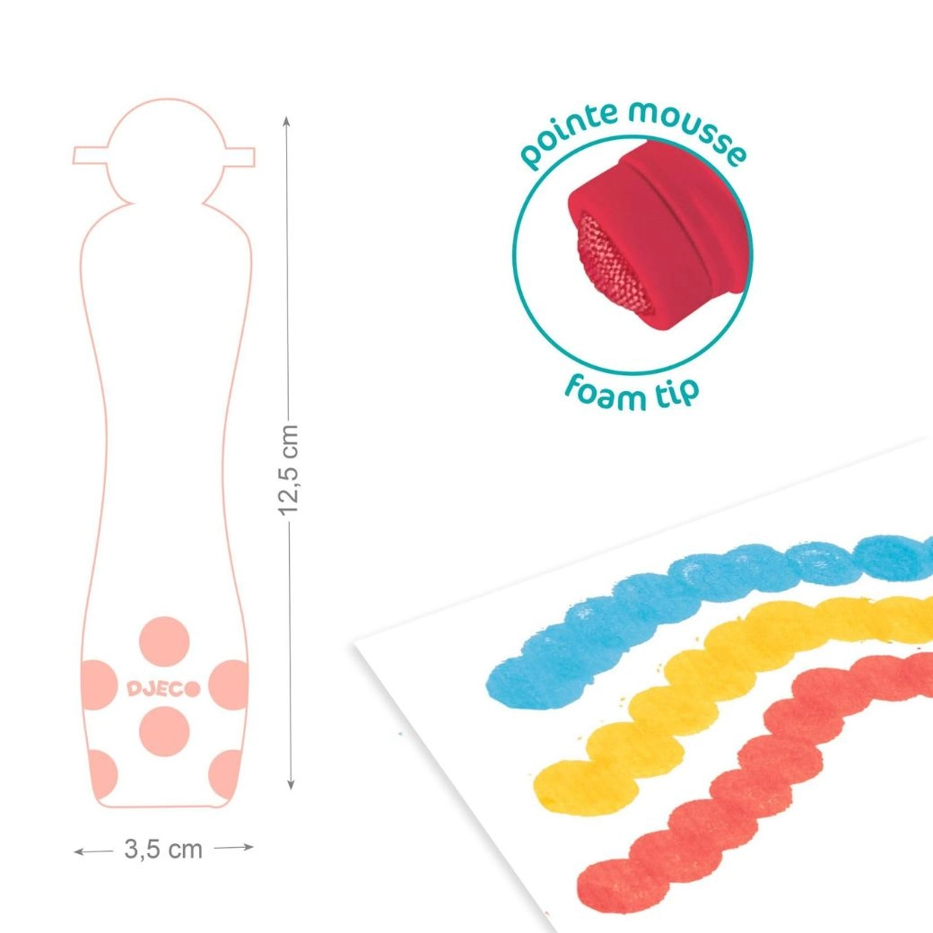DJECO putu krāsas ar praktisku sūklīša aplikatoru ir ideāla izvēle pirmajai radošajai darbošanai. Bērni vienkārši piespiež un veido punktiņus, vilcienus un rakstus – bez otām un bez nekārtības. Ergonomiski veidotās pudelītes ērti iegulst arī mazās bērnu rociņās un veicina dabisku tvērienu.