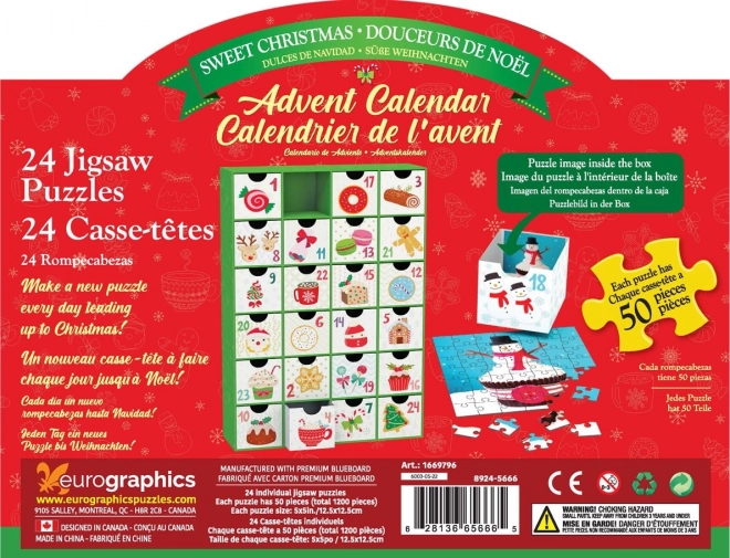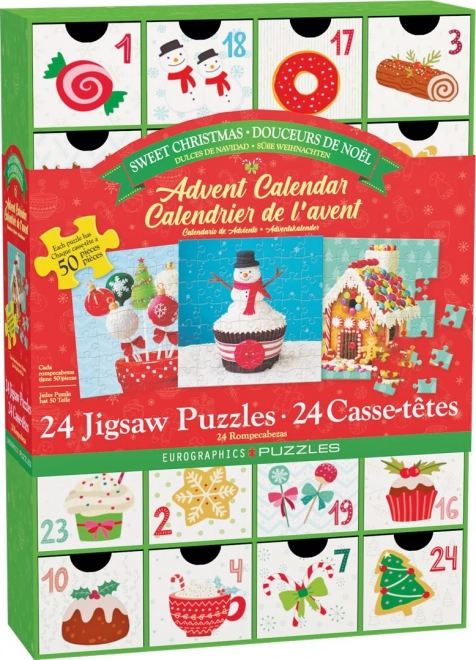 EUROGRAPHICS adventes kalendārs “Saldas Ziemassvētku dienas” pārvērš decembri rotaļīgā tradīcijā. Katra no 24 atvilktnītēm slēpj kvadrātveida 50 detaļu puzli ar gardiem saldumu motīviem. Attēlu izmērs ir 12,5 × 12,5 cm, un paraugs ir izdrukāts uz katras atvilktnītes aizmugures ērtākai likšanai.