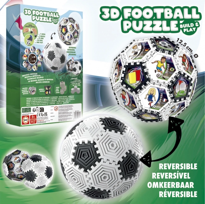 Saliec un spēlē ar oriģinālu divpusēju 3D puzli futbola bumbas formā. Pēc salikšanas iegūsi stingru un funkcionālu bumbu, kuru var izrotāt ar futbola uzlīmēm un izmantot spēlēm.