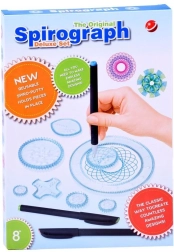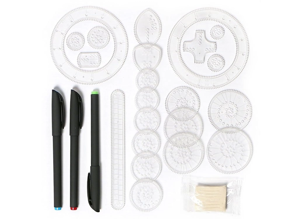 Šis radošais spirogrāfa komplekts ļauj bērniem veidot aizraujošus apļveida un ziedu rakstus ar caurspīdīgiem lineāliem un zobratainiem riteņiem. Vienkārši griežot riteņus ar ieliktu flomāsteru, top kompleksi ģeometriski zīmējumi, kas izskatās profesionāli bez sarežģītām prasmēm.