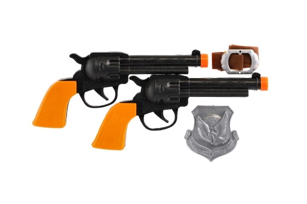 Divi stilīgi kolti ar oranžiem rokturiem un melnām stobrām sniedz autentisku vesternu pieredzi katrā iedomātā pāršaudē.
