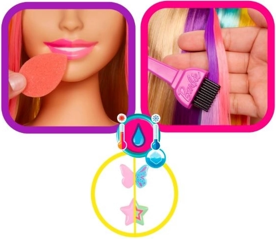 - BARBIE ķemmēšanas galva ar krāsainām šķipsnām, stīpiņa, 3 krāsainas matu gumijas, 4 mini gumijas, 4 sprādzes, 8 tauriņveida dekorācijas ar krāsas maiņu, pievienojama šķipsna, rozā suka, rozā sūklītis, violeta ota, zila bļodiņa