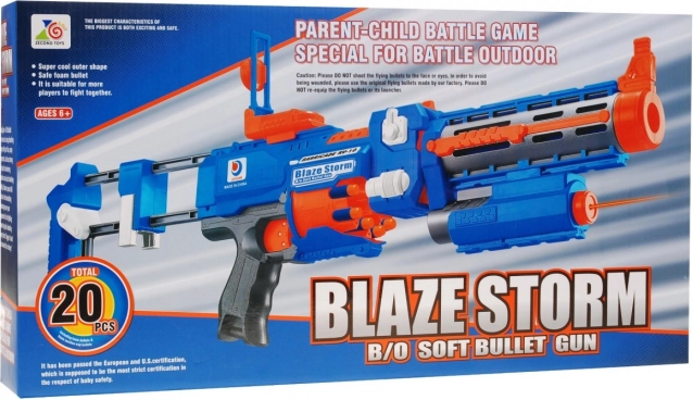 Iepakojumā ir 20 putu šāviņi un lāzera tēmētājs. Pārbīdamais apkalpošanas lodziņš palīdz bultas aizķeršanās gadījumā, bet ON/OFF slēdzis droši bloķē mēlīti.
