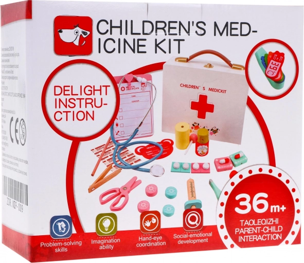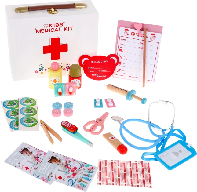 Šajā koka ārsta komplektā ir viss, kas mazajam ārstam nepieciešams savu pacientu aprūpei. Komplektā ir 30 dažādas detaļas, kas ar formām un krāsām atdarina īstus medicīnas instrumentus. Ar šo komplektu bērni ne vien pārvar bailes no ārstiem, bet arī izbauda fantāzijas un prieka pilnas rotaļas. Atsevišķie elementi ir draudzīgi un koši, kas piesaista bērnu uzmanību un mudina uz atklājumiem.