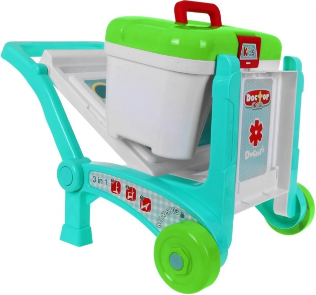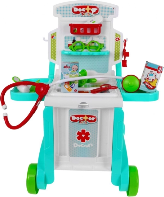 Šis bērnu ārsta komplekts maigos pasteļtoņu krāsās sniegs stundām ilgu izklaidi un mācīšanos. Ratiņgaldu viegli pārveidosiet par diviem dažādiem ratiņu variantiem atbilstoši bērna vecumam un augumam, savukārt koferītis droši ietilpina visus instrumentus. Uz galda ir 2 sānu plauktiņi nepieciešamajiem piederumiem un uzstādne ar plauktiņiem un āķiem “zālēm” un papildinājumiem. Pateicoties rokturim, visu praksi var ērti pārvietot no istabas uz istabu.
