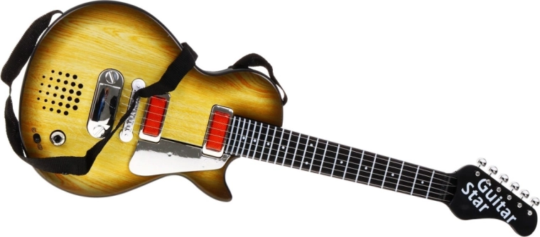 Šī stilīgā bērnu ģitāra ar koksnes imitācijas dizainu ir ideāla izvēle mazajiem mūziķiem. Pateicoties kompaktajiem izmēriem, tā lieliski der bērniem no 3 gadiem un motivē atklāt ritmu un muzikālo radošumu. Ģitārai ir sešas metāla stīgas, kas, pieskaroties, skan, un tā piedāvā divus režīmus – roka pavadījuma atskaņošanu un spēli uz stīgām.