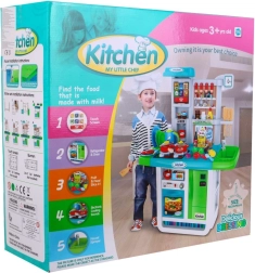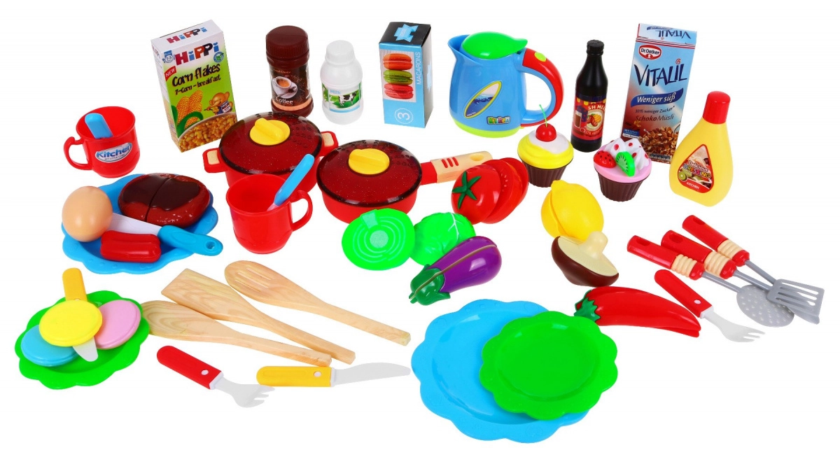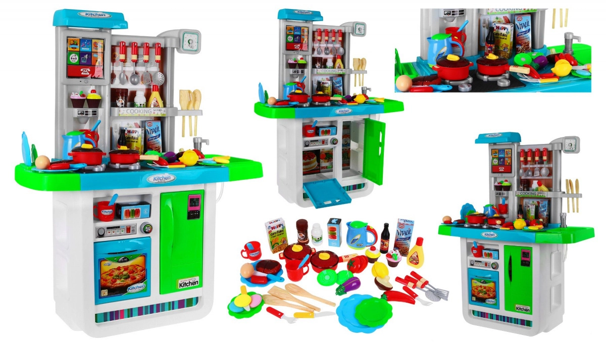 Komplektā ir trauku žāvētājs, iebūvēts griešanas dēlītis, pulkstenis, sānu plaukti un daudz virtuves piederumu, pārtikas produktu un trauku. Virtuvīti ir viegli salikt, tai ir CE sertifikāts un tā ir lieliska dāvana.