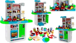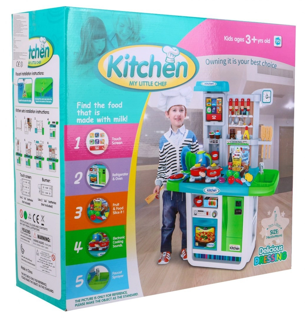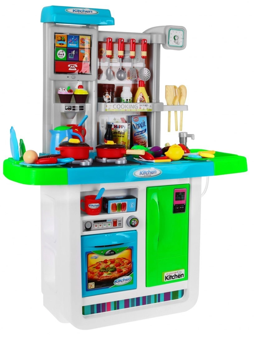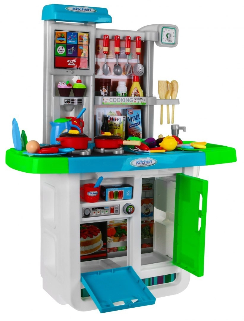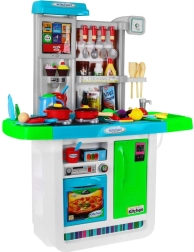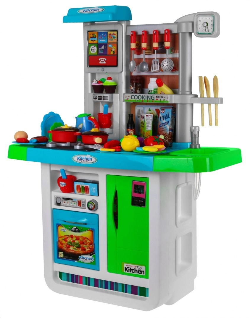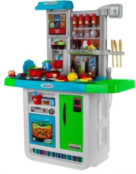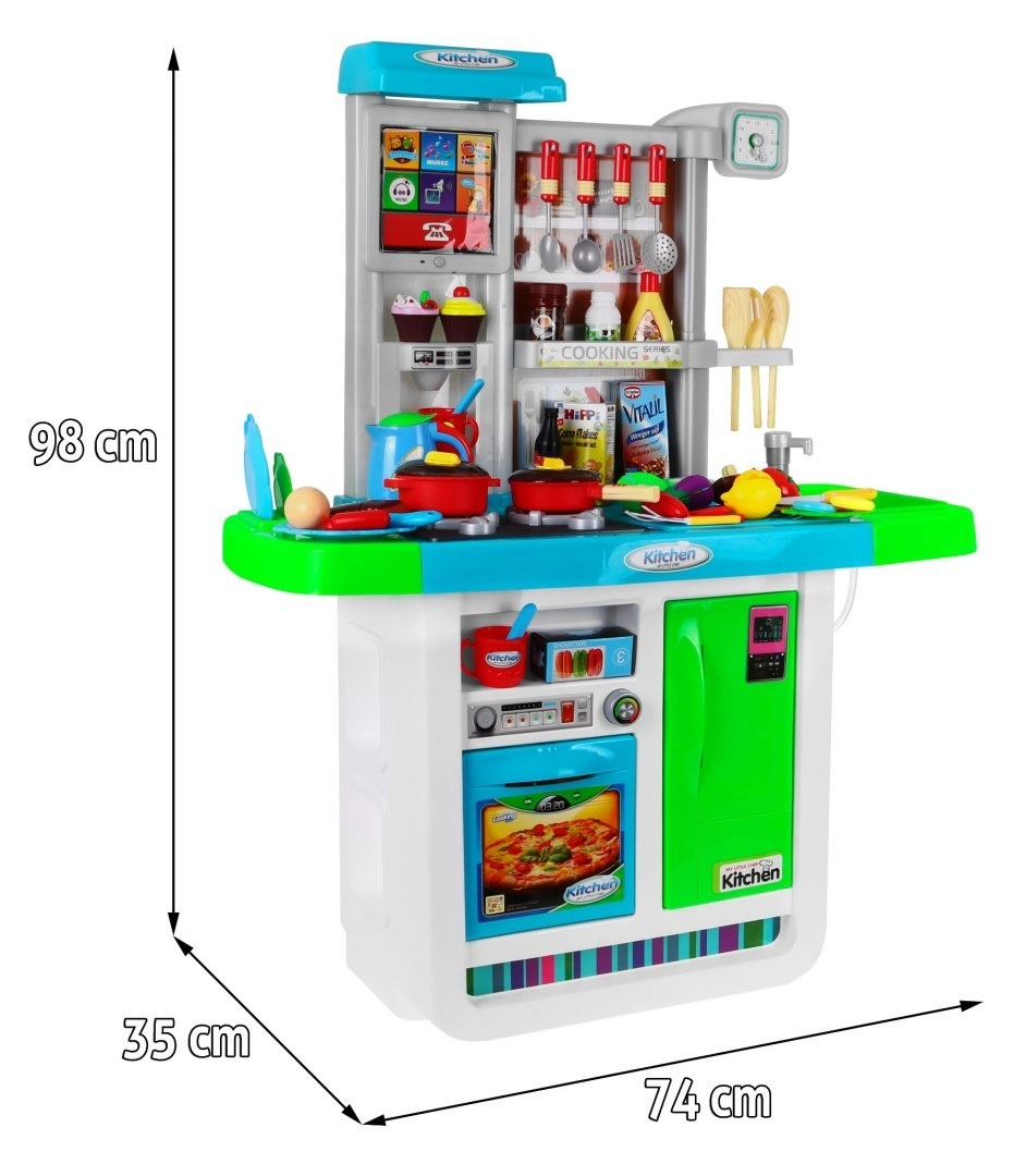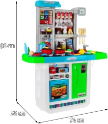 Šī plašā bērnu virtuvīte košās krāsās piedāvā realistiskus piederumus un funkcijas, kas ļauj bērniem atdarināt gatavošanu kā īstā virtuvē. Divi degļi ar gaismu un cepšanas/vārīšanas skaņām, izlietne ar īstu ūdeni un skārienpanelis ar melodijām un skaņām nodrošina aizraujošu spēli.