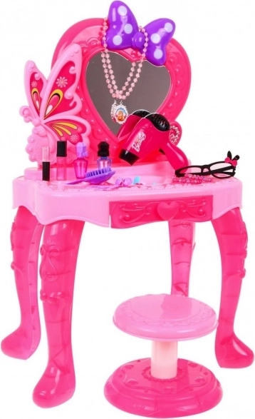 Šis rozā bērnu tualetes galdiņš pārvērš jebkuru istabu par burvīgu skaistumkopšanas stūrīti. Sirsniņformas spoguli rotā lente ar gaismas efektiem un patīkamu melodiju, kas veicina iztēli spēlējot salonu. Komplektā ir arī funkcionāla rotaļu fēna ar reālu skaņu un pūšanu, padarot rotaļas vēl autentiskākas.