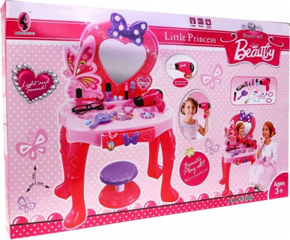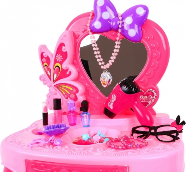 Lentes dekorācija virs sirsniņformas spoguļa iedegas un mirgo, pavadīta ar melodiju. Bērni izbaudīs reālistisku un aizraujošu skaistumkopšanas salona spēli.