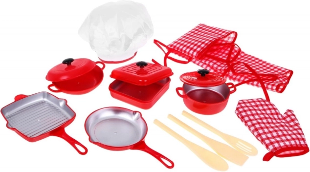 Šis sarkanais virtuves komplekts ir ideāli piemērots spēlei mājās, virtuvē vai “restorānā”. Bērni saņem patiesi izskata traukus ar vākiem, pannas un piederumus, kā arī pilnu pavāra tērpu. Viss veidots iecienītajā sarkanajā krāsā un izmēros, kas piemēroti mazām rokām.