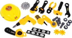 - 23 daļu komplekts ar reālistiskiem piederumiem – ķivere, urbjmašīna, āmurs, zāģis, atslēgas, knaibles un citi.