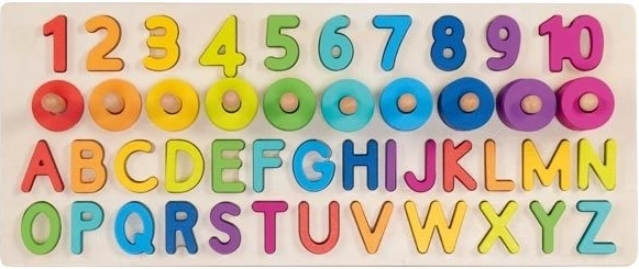 Mūsu komplektā ir 91 dažāds elements, tostarp koka pamatne, burti (26 gab.) un cipari no 1 līdz 10, kā arī 55 krāsaini gredzeni. Bērni var viegli trenēt ciparu atpazīšanu un saskaitīšanu un veidot vienkāršus vārdus.