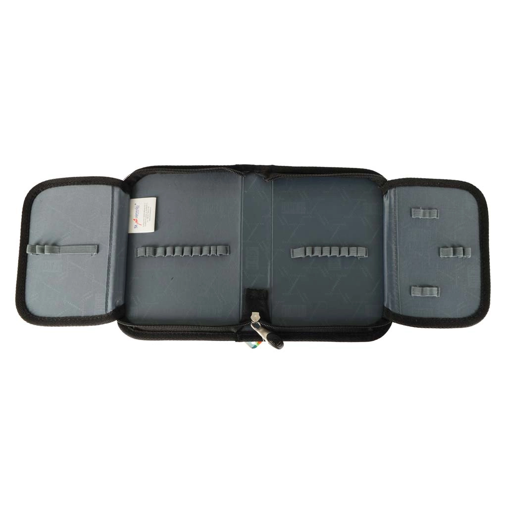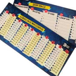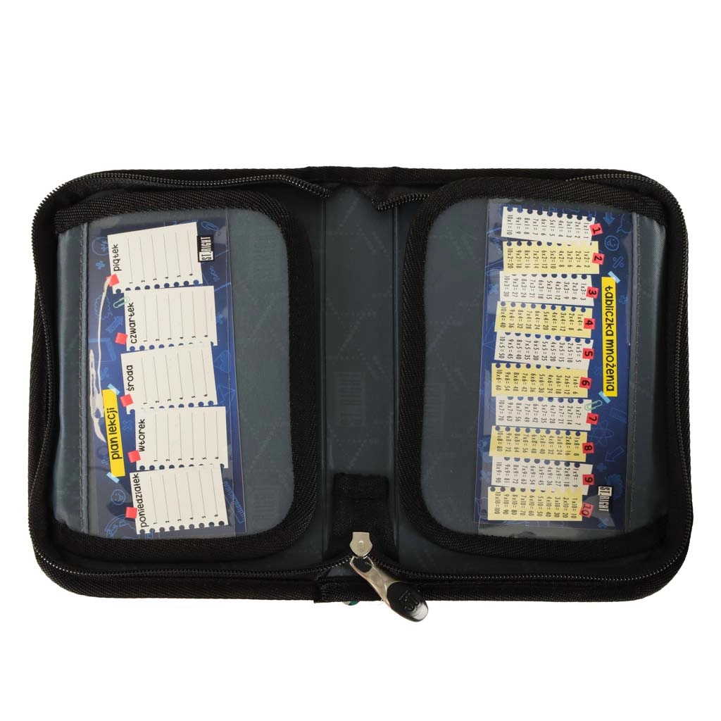 Iekšējais izkārtojums ar gumijas cilpām un starpsienām palīdz uzturēt kārtību un novērš brīvu zīmuļu un krītiņu kustību. Praktisks bonuss ir reizināšanas tabula un nedēļas stundu saraksts, kas atvieglo mācību sagatavošanos.