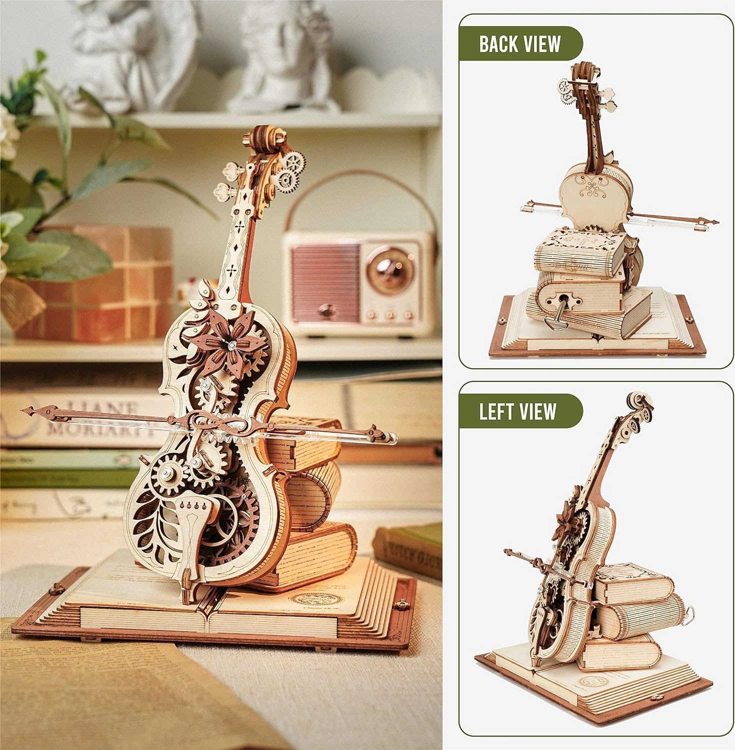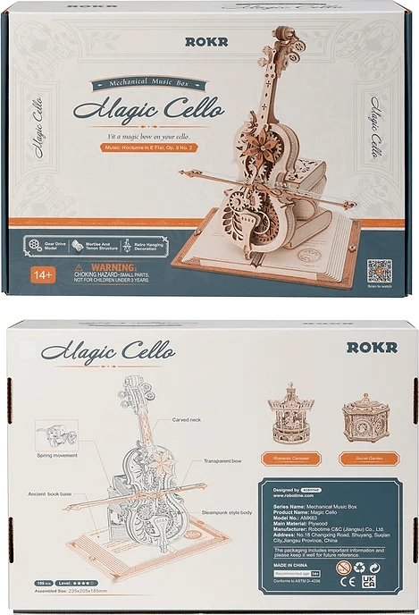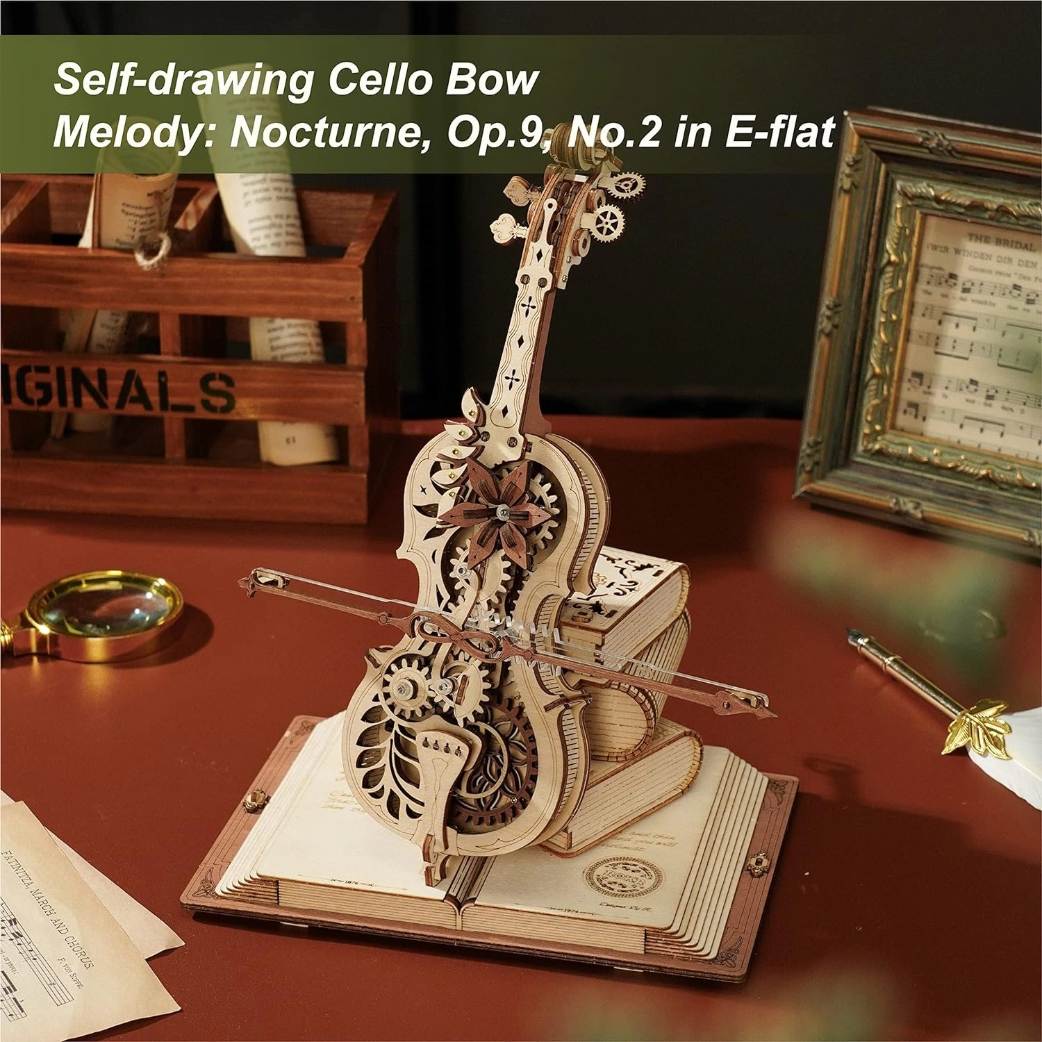 Elegants čella modelis uz pamatnes no trim grāmatām izceļas ar romantisku, retro izskatu un klasiskiem Eiropas rakstiem. Precīzi izgrieztās koka un metāla detaļas nevainojami sader kopā, un pēc uztīšanas atskan slavenā melodija Nokturns, Op. 9 Nr. 2 (Mi bemol mažors), kamēr lociņš vienmērīgi kustas turp un atpakaļ. Rezultāts ir apburošs mūzikas un mehānikas savienojums, kas izcelsies jebkurā interjerā.