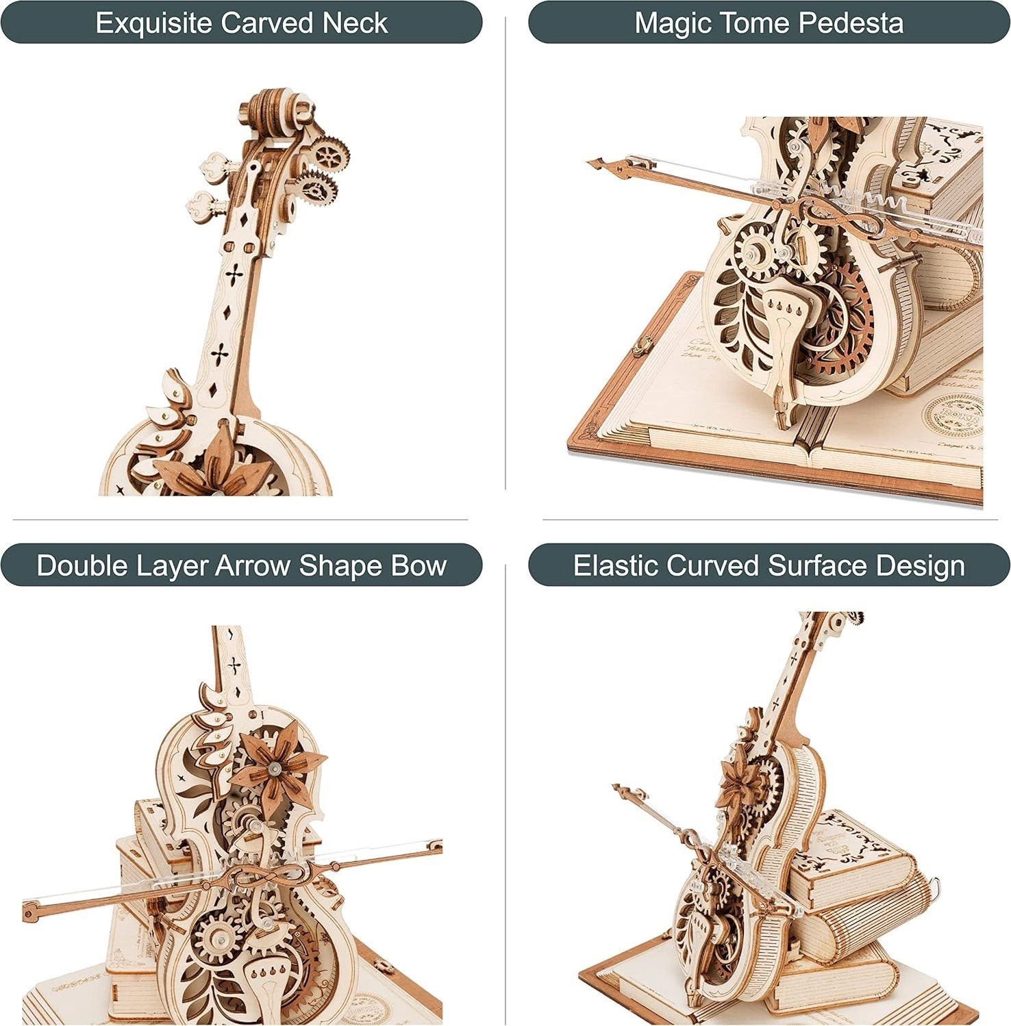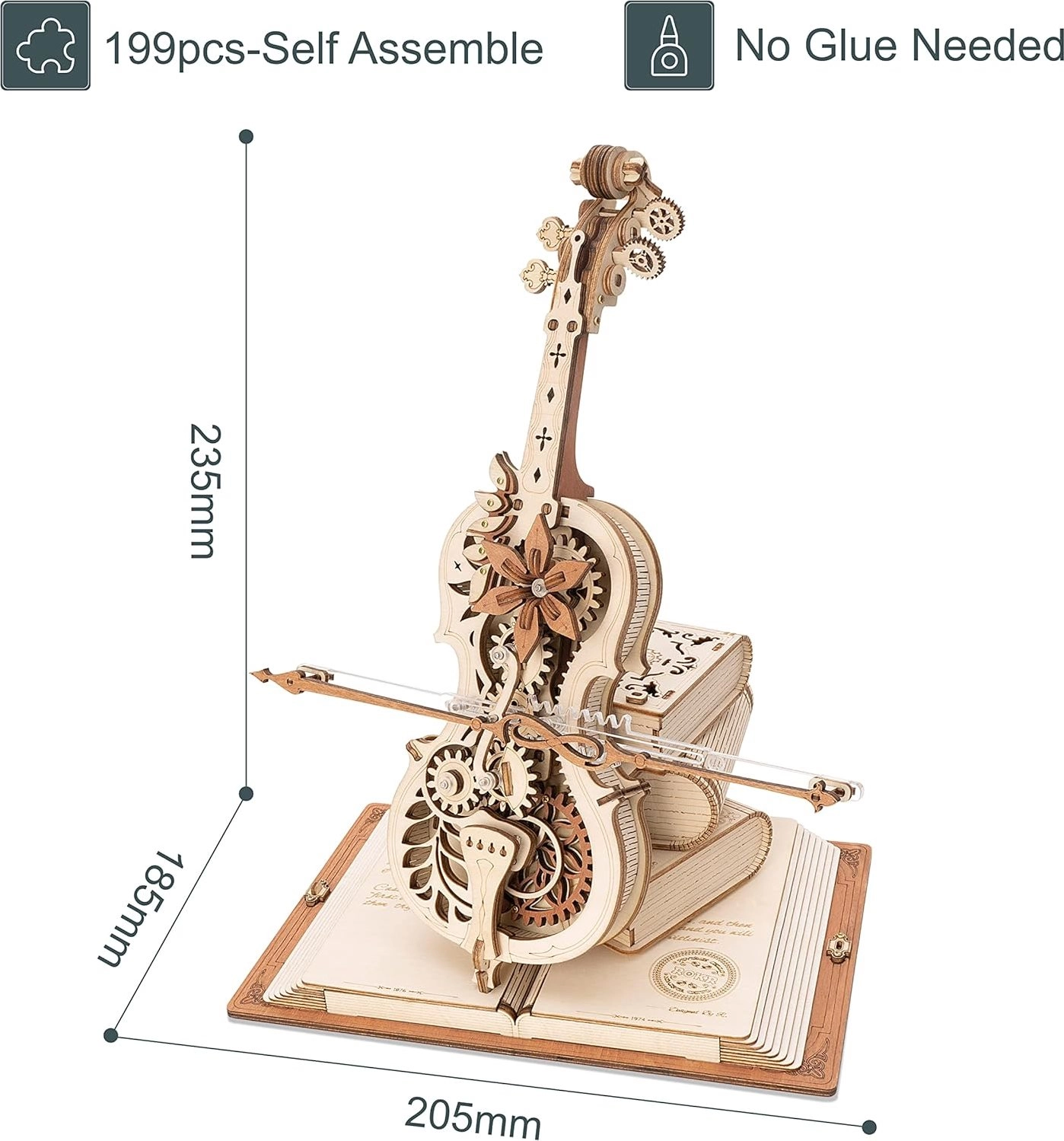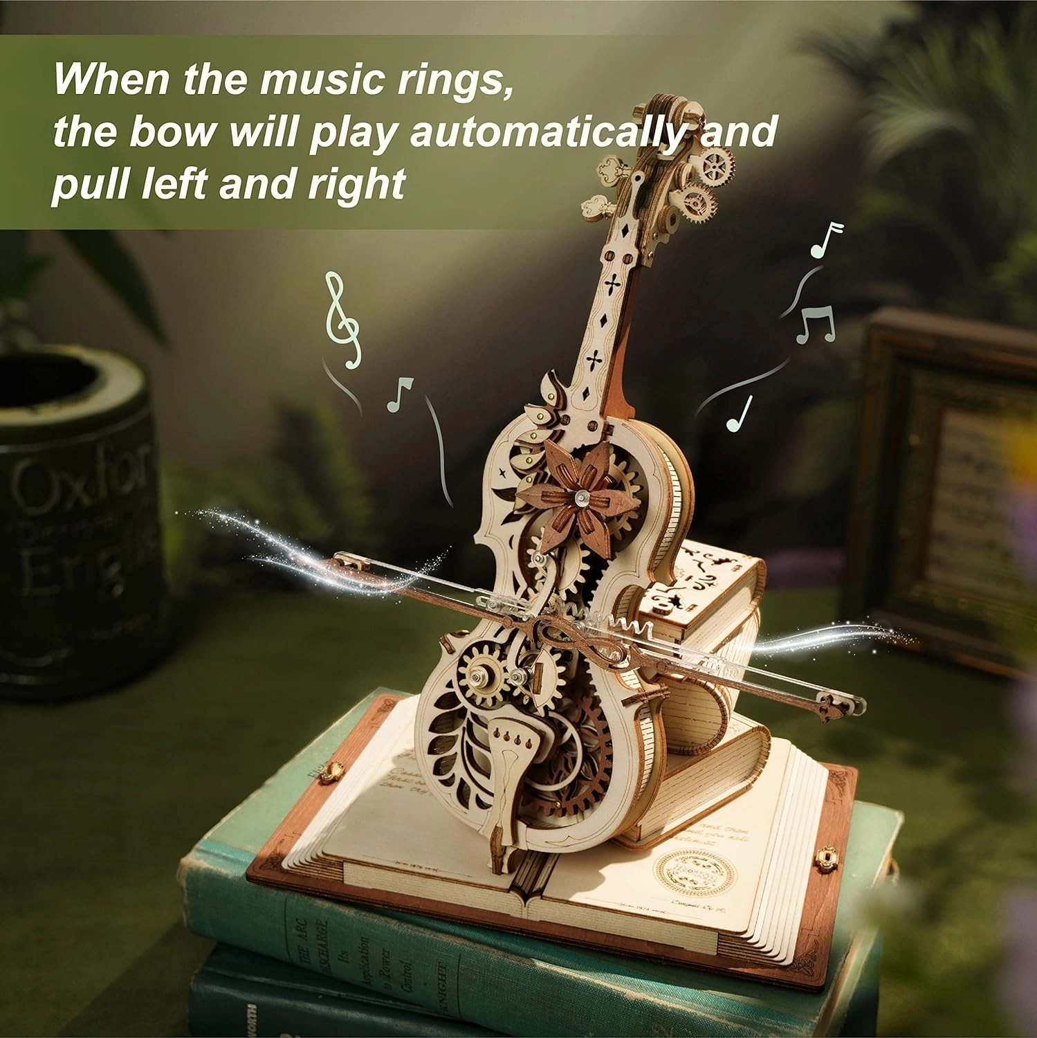 Elegants čella modelis uz pamatnes no trim grāmatām izceļas ar romantisku, retro izskatu un klasiskiem Eiropas rakstiem. Precīzi izgrieztās koka un metāla detaļas nevainojami sader kopā, un pēc uztīšanas atskan slavenā melodija Nokturns, Op. 9 Nr. 2 (Mi bemol mažors), kamēr lociņš vienmērīgi kustas turp un atpakaļ. Rezultāts ir apburošs mūzikas un mehānikas savienojums, kas izcelsies jebkurā interjerā.