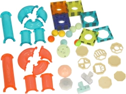 Komplekts piedāvā universālu būvēšanu 2D un 3D formātā: no vienkāršām formām līdz sarežģītām trasēm. Magnētiskie kvadrāti nodrošina stabilu konstrukciju, savukārt caurules un tuneļi viegli iestiprinās “ar klikšķi”. Pateicoties spīdošajām detaļām un lodītēm, katrs nobrauciens pārtop aizraujošā, vizuāli piesaistošā izrādē.