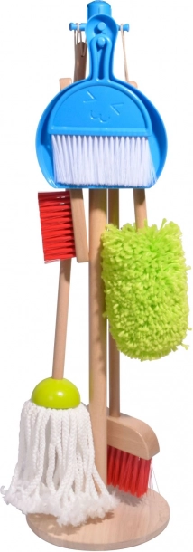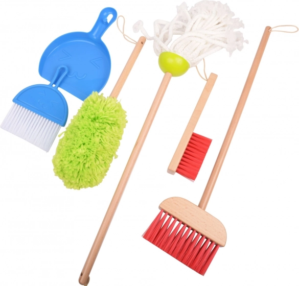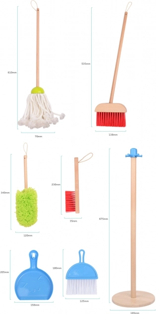 Komplektā ir krāsaini rotaļu rīki, tostarp slotas, mops un putekļu slota, kas bagātina bērnu vizuālo un rotaļu pieredzi.