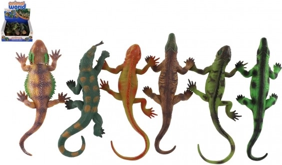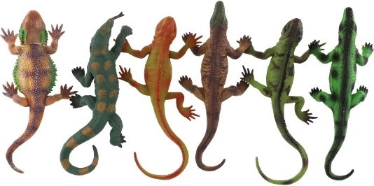 Šajā komplektā ir 12 dažādkrāsainas ķirzakas ar piesūcekņiem apakšpusē, kas ļauj tās piestiprināt pie stikla, flīzēm vai citām gludām virsmām. Katra ķirzaka ir 22 cm gara, kas nodrošina ērtu lietošanu bērniem. Spēle ar šo komplektu veicina radošumu, sīko motoriku un sniedz gan izklaidi, gan zināšanas par dabu.