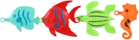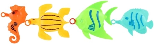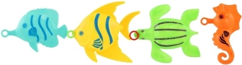 Komplektā ir 4 košas zivtiņas, kas rosina bērnu iztēli un motivē spēlei un sacensībām – kurš tās noķers visātrāk?