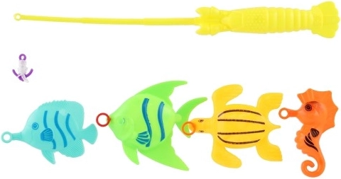 Iepakojumā atradīsiet 4 krāsainas zivtiņas un bērnu makšķeri ar āķīti. Pateicoties vieglajai konstrukcijai, ar to viegli rīkoties arī mazākiem bērniem. Komplektu var izmantot gan istabā, gan ūdenī. Atsevišķu detaļu krāsu varianti var atšķirties.