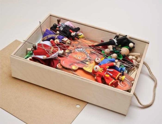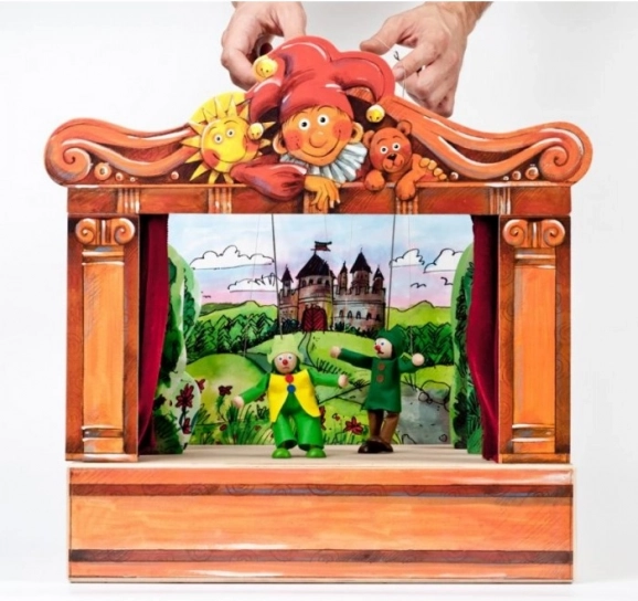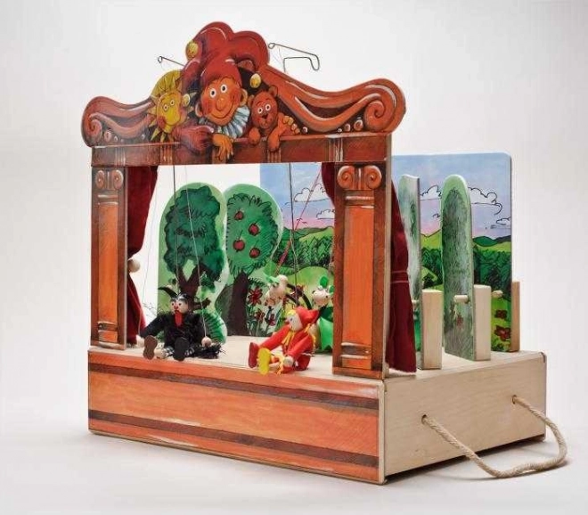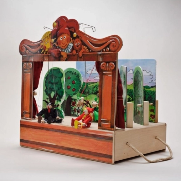 Koka teātris ar 2 divpusējām kulisēm un 8 lellēm. Roku darbs lelles ar iespēju paplašināt komplektu ar papildu lellēm un kulisēm.