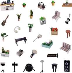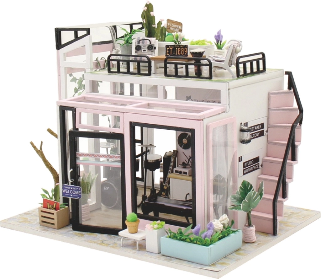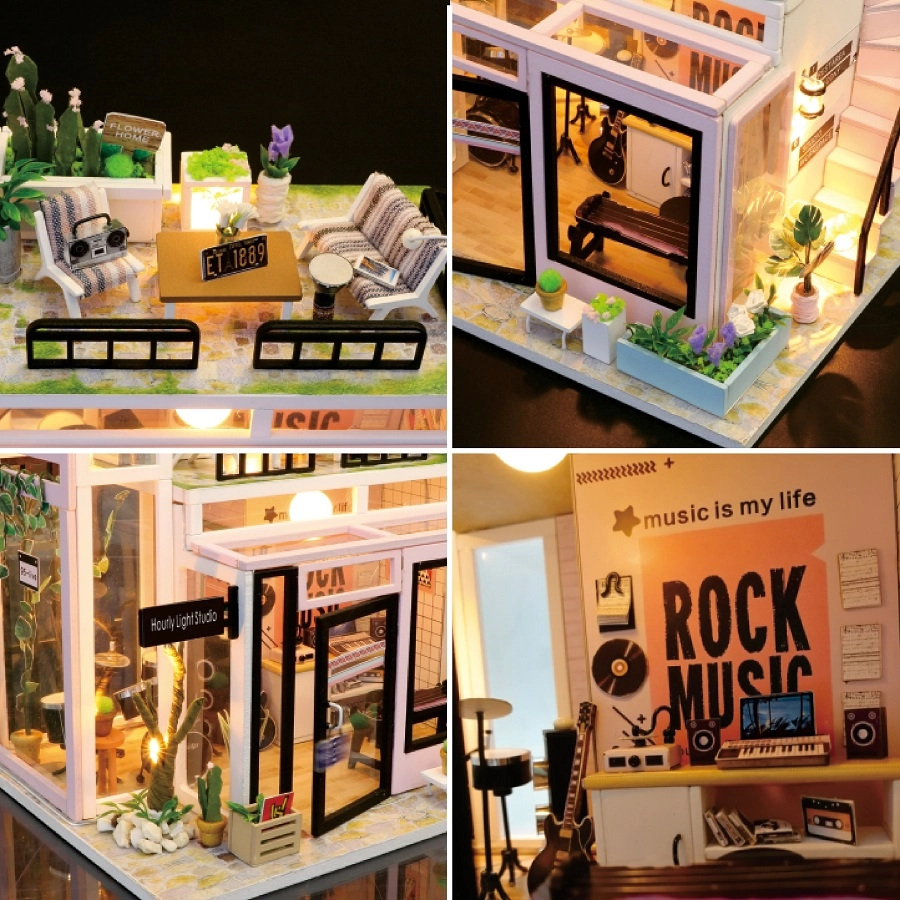 Izveidojiet savu mūzikas pasauli detalizēta miniatūra namiņa – Mūzikas studija – veidolā. Komplektā iekļauts viss nepieciešamais salikšanai, tostarp sīki instrumenti un piederumi. Pateicoties LED apgaismojumam (barošana ar 2× AA baterijām, nav iekļautas), izcelsies visas detaļas, un jūsu darinājums pārvērtīsies par mājīgu dekoru.