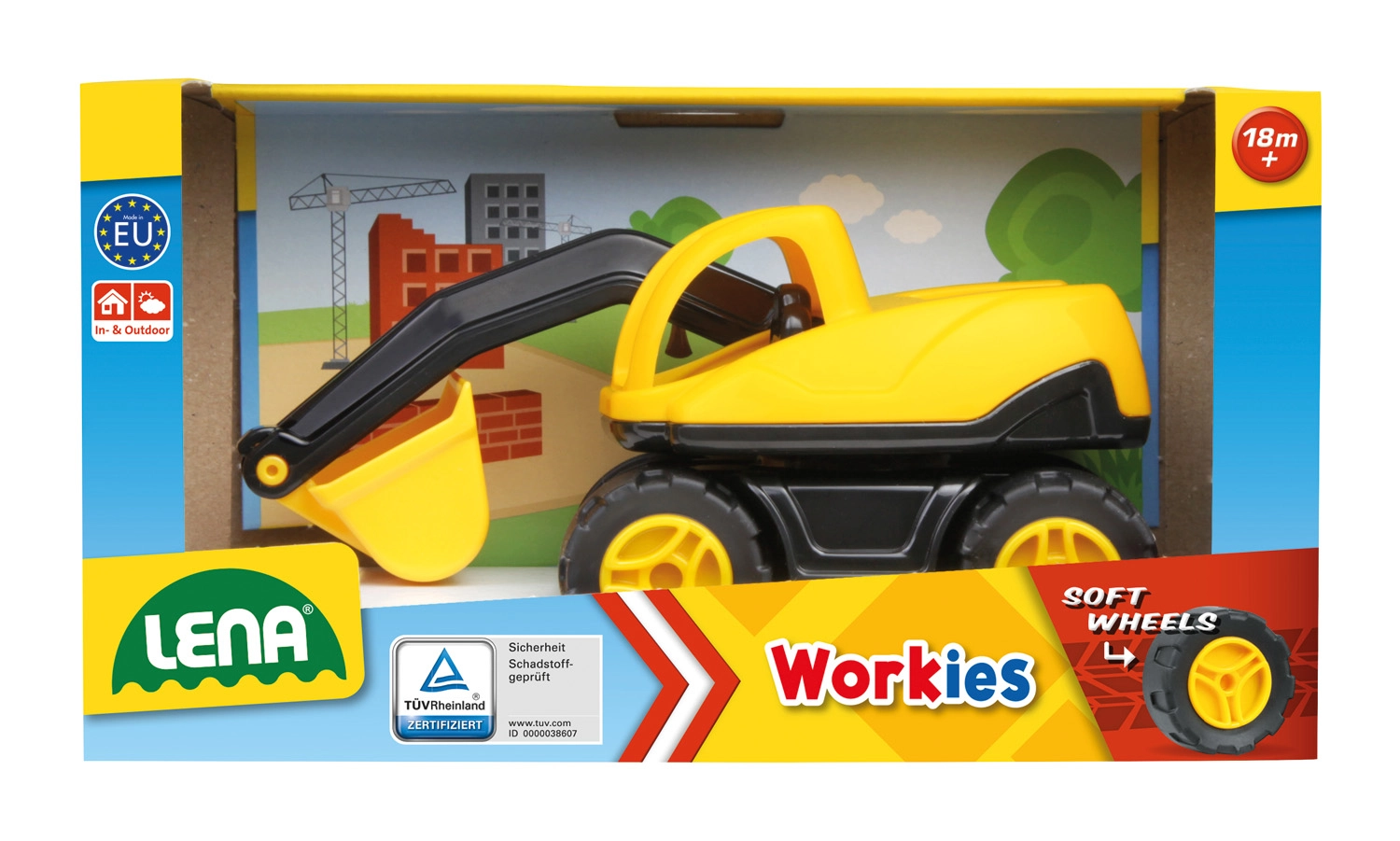 LENA Workies ekskavators ir ideāla rotaļlieta mazajiem būvniekiem. Izturīgā ABS plastmasas konstrukcija iztur ikdienas rotaļas mājās un ārā, savukārt gumētās riepas nodrošina plūdenu kustību uz dažādām virsmām. Pateicoties kompaktajam izmēram, to ir viegli satvert pat pašiem mazākajiem.
