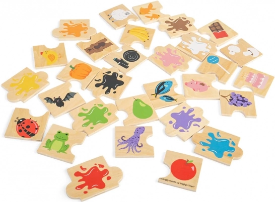 Izklaidējoša koka didaktiskā puzle no Bigjigs Toys māca bērniem atpazīt krāsas ar 30 detaļām 10 krāsās. Savieno trijniekus (dzīvnieks, priekšmets, krāsa), attīsta acu–roku koordināciju, loģisko domāšanu un paplašina vārdu krājumu. Piemērota bērniem no 2 gadiem.