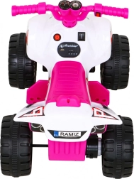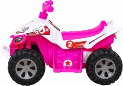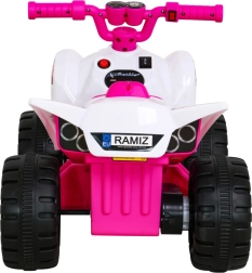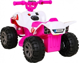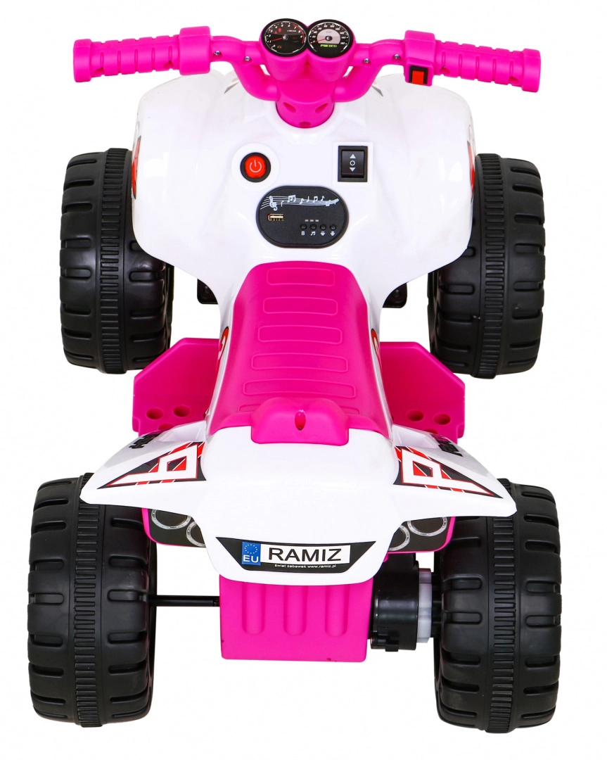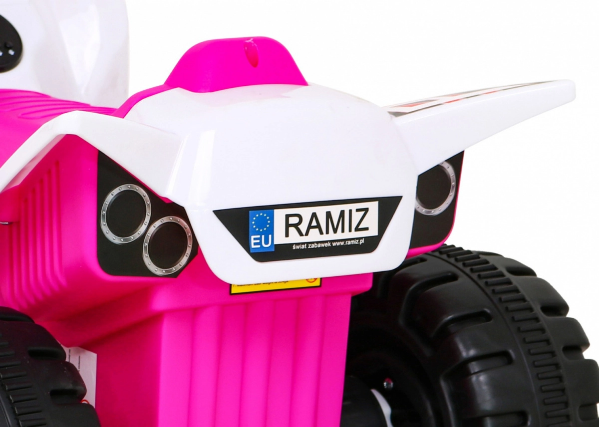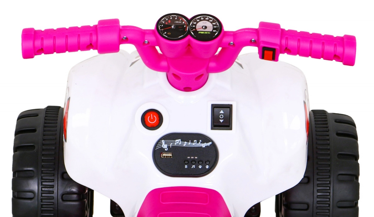 Šis kompaktas klases elektriskais kvadricikls ir ideāli piemērots bērnu pirmajai braukšanas pieredzei. Vadība ir maksimāli vienkārša: bērns palielina ātrumu, nospiežot pogu rokturī, un var izvēlēties virzienu uz priekšu / atpakaļ. Izturīga konstrukcija ar līdz 30 kg noslodzi un laba caurgājība, pateicoties 4 lieliem riteņiem, sniedz drošību gan mājās, gan ārā.