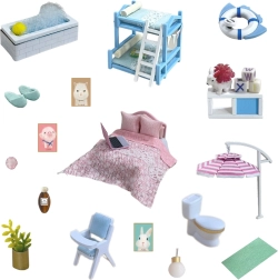 Teleskops, šūpoles, slidkalniņš, baloni un citas sīkas lietiņas piešķir ainai dzīvīgumu. Pateicoties daudzajām dekorācijām, mājiņu varēsiet pielāgot tieši savai fantāzijai.