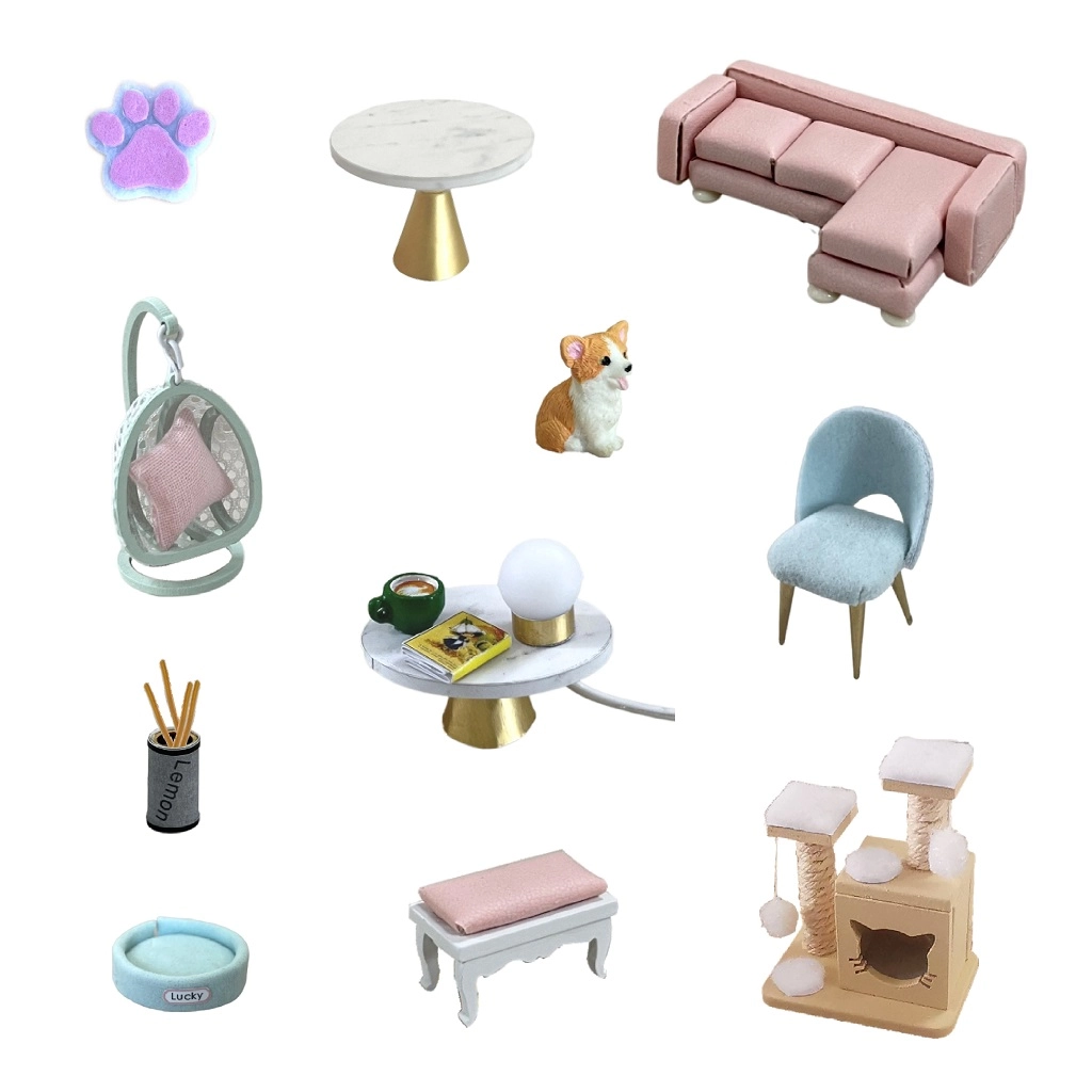 Ērts dīvāns, piekaramais krēsls, elegants galds un mīlīga kaķenīte ar nagu asināmo – katrs elements ir precīzi veidots reālistiskam interjera izskatam.
