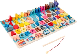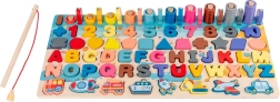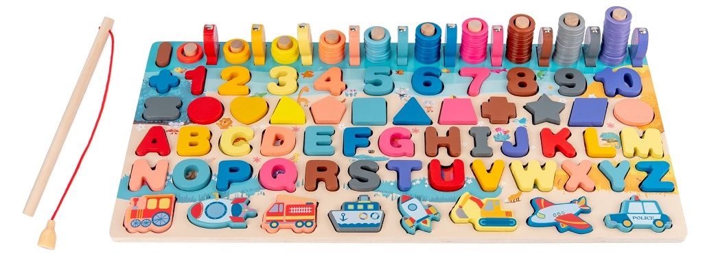 Dēlītes komplektā ir magnētiska makšķere, kas ļauj bērniem izmēģināt makšķerēšanas spēli ar atsevišķiem elementiem.
