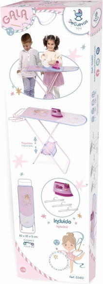 Salokāmais gludināmais dēlis lellēm no GALA kolekcijas bērniem sniedz autentisku pieredzi rūpēs par lelļu apģērbiem. Pateicoties regulējamam augstumam 55 / 60 / 63 cm, tas “aug” līdzi bērnam un paliek ērts arī pēc vairākiem gadiem. Rozā–baltā dizaina apvienojums ar smalkiem sportiskiem motīviem un papildinošu zilo krāsu izskatās moderni un rotaļīgi.