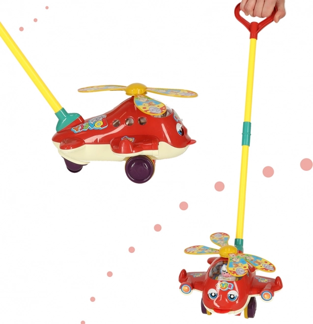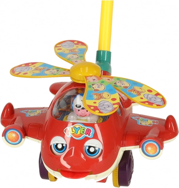Rotaļlietas dizainā izmantotas košas krāsas un jautri motīvi, kas piesaista bērnu uzmanību. Sarkanajam helikopteram kustības laikā griežas propelleri un skan zvaniņš. Atbalsta kāts ir veidots atbilstoši bērna augumam un to var viegli salocīt ērtai uzglabāšanai vai pārvadāšanai.