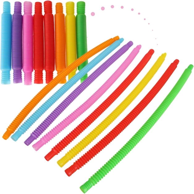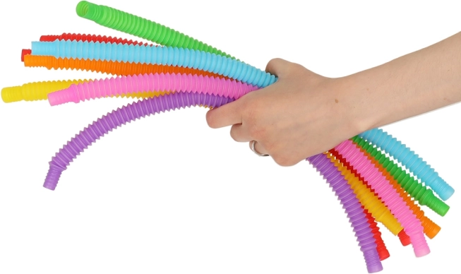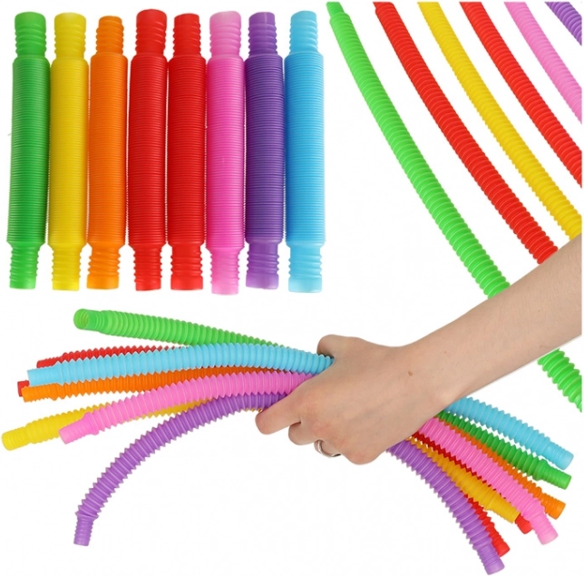 Atklājiet sensoro cauruļu burvību, kuras bērni dievina! Katra no astoņām krāsainajām caurulēm piedāvā stundām ilgu izklaidi, pateicoties savai elastīgajai būtībai. Tās var izstiept, griezt un savienot dažādās formās, dodot bērniem plašas iespējas radošumam.