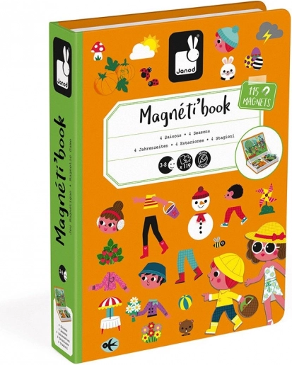 Magnētiskā grāmata Janod Magnetibook – gadalaiki attīsta fantāziju, loģisko domāšanu un sīko motoriku. Bērni pēc kartītēm veido dažādu gadalaiku ainas un izvēlas tām atbilstošu apģērbu un aksesuārus. Pateicoties kompaktajai grāmatas formas konstrukcijai, tā ir ideāli piemērota ceļojumiem, automašīnai un ciemošanās reizēm.