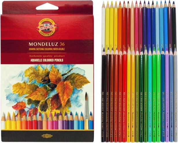 KOH-I-NOOR MONDELUZ akvareļu zīmuļu komplekts ar 36 gabaliem ir ideāls gan detalizētai zīmēšanai, gan gleznošanai ar ūdeni. Pigmenti izceļas ar izcilu gaismnoturību un krāsu tīrību, tāpēc jūsu darbi ilgi saglabāsies spilgti un izteiksmīgi. Saskarē ar otu un ūdeni līnija skaisti izklājas, ļaujot panākt akvarelim raksturīgos efektus.