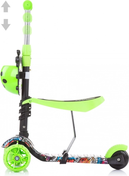 Augstumu viegli pielāgot – sēdeklim ir 3 pozīcijas (22–29 cm) un stūrei arī 3 pozīcijas pareizai ergonomikai. Priekšējie riteņi ar krāsainām LED gaismām iedegas braukšanas laikā un piešķir katram braucienam vairāk jautrības un redzamības. Praktisks priekšējais groziņš glabā sīkumus, gumijas rokturi ir patīkami rokai un nodrošina labu satvērienu.