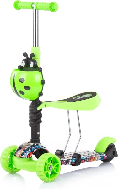 Priekšējie riteņi ar krāsainām LED gaismām uzlabo redzamību un jautrību, trīsriteņu stabilitāte un aizmugurējā kāju bremze parūpējas par drošu apstāšanos.