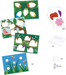 - 21 ziedu un dzīvnieku izgriezums, 4 iepriekš apdrukāti attēli, 3 stikla lodītes, 4 krāsas, ilustrēta instrukcija