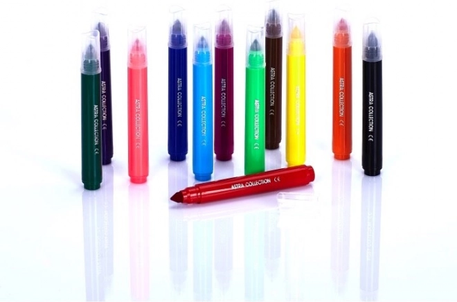 Krāsaina komplekta izvēle mazajiem māksliniekiem: 12 spilgti Jumbo flomāsteri no zīmola ASTRA ar drošu ventilējamu vāciņu, izturīgu šķiedru galu un izmazgājamu, veselībai nekaitīgu tinti. Flomāsteri ir izturīgi pret izžūšanu līdz pat 3 gadiem un nodrošina vilciena platumu 6 mm izteiktiem triepieniem.
