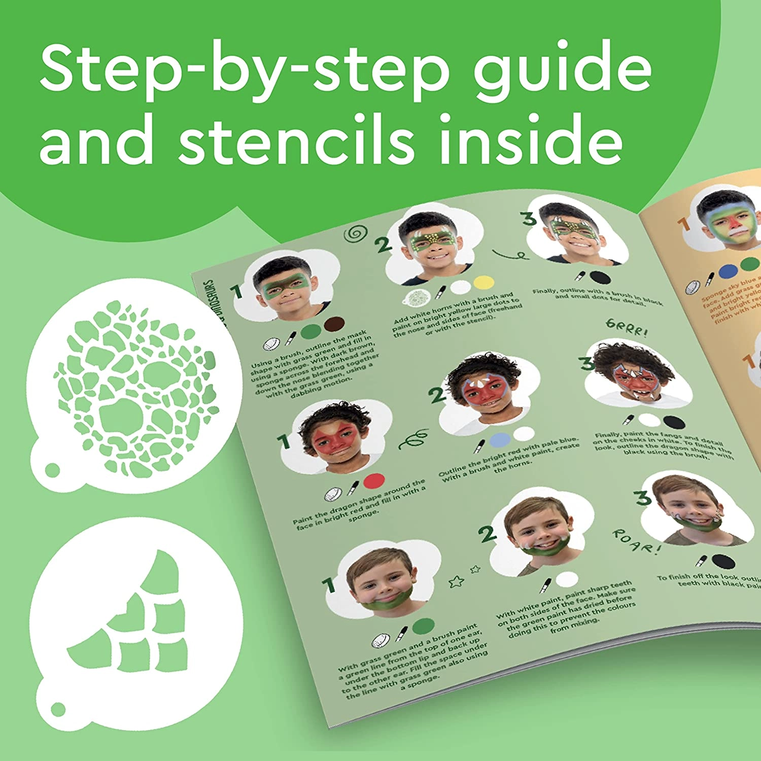 Komplektā ietilpst 8 kvalitatīvas krāsas, trafareti vieglai motīvu veidošanai, sūklīši, otiņa un ilustrēta pamācība gan iesācējiem, gan pieredzējušiem lietotājiem. Krāsas viegli nomazgājamas ar ūdeni un ziepēm, kas nodrošina vienkāršu noņemšanu.