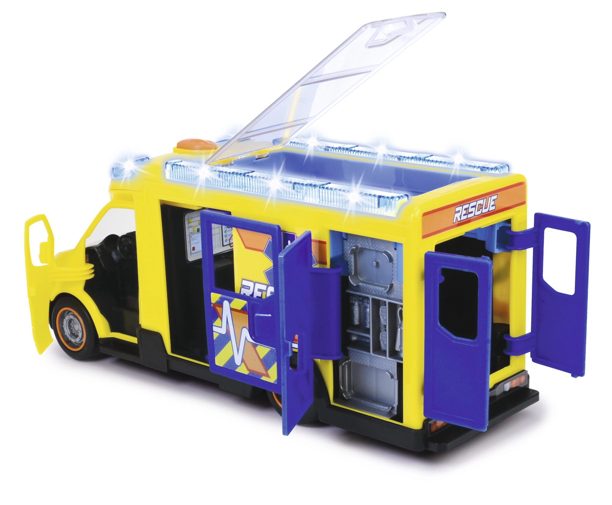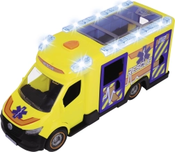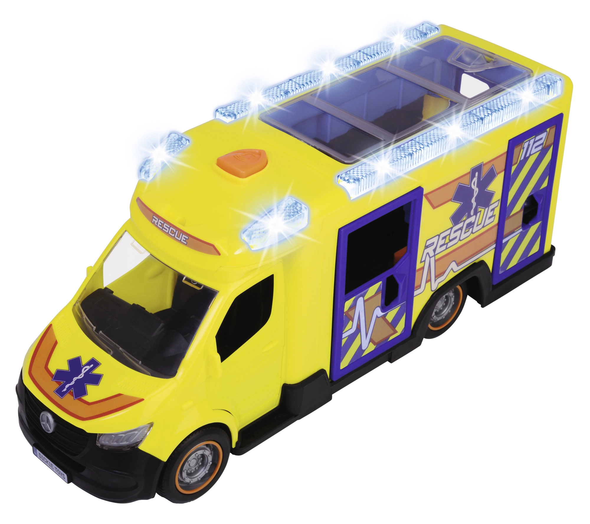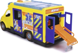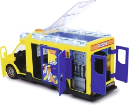 Šis Mercedes-Benz Sprinter no Dickie Toys sniedz īstu glābšanas pieredzi ar gaismas un skaņas funkcijām. Transportlīdzeklim ir atveramas vadītāja, pasažiera, sānu un aizmugures durvis, kā arī caurspīdīgs jumts, kas nodrošina piekļuvi detalizētam salonam.