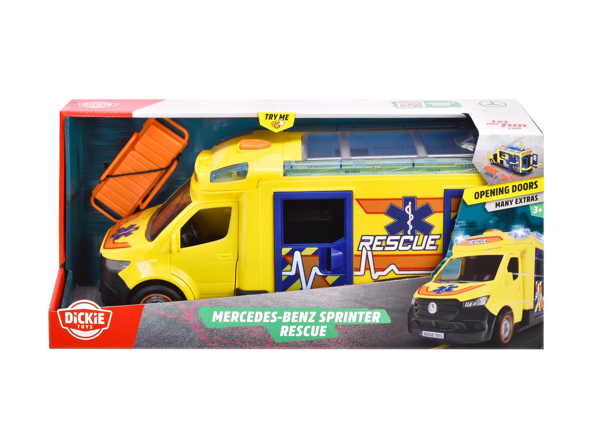 Komplektā ietilpst nēsājamas nestuves, aptieciņa un mugursoma, kas bērniem ļauj iejusties glābēju lomā. Transportlīdzekļa garums ir 34,5 cm, un tas ir oficiāli licencēts no Mercedes-Benz.